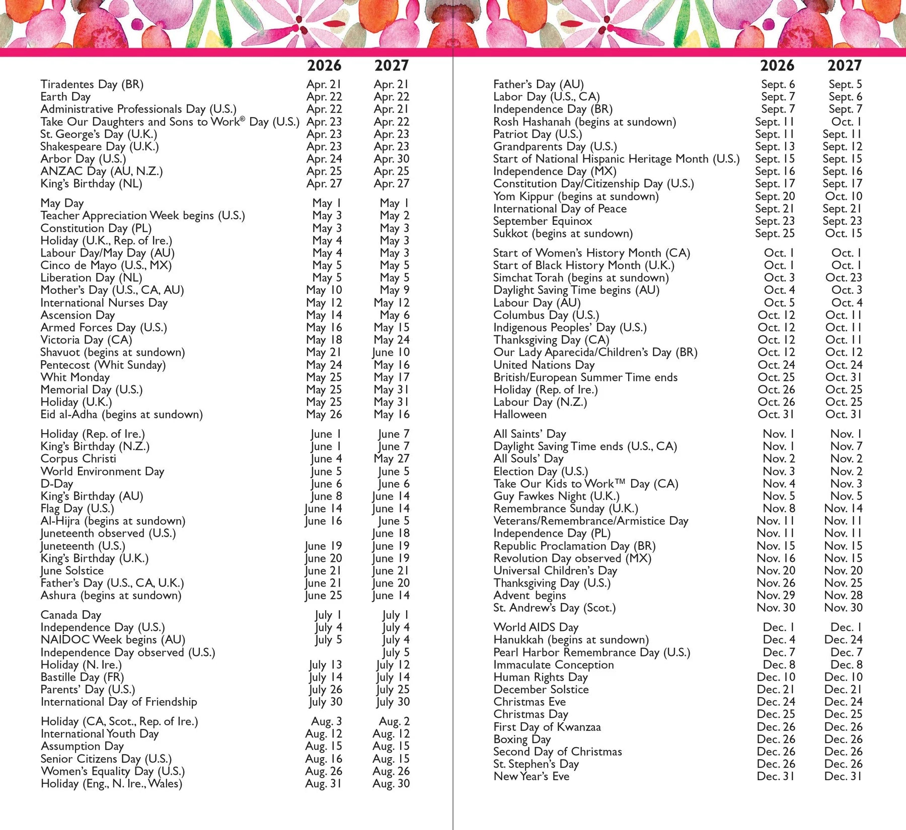 - You'll also find a full list of holidays and observances.