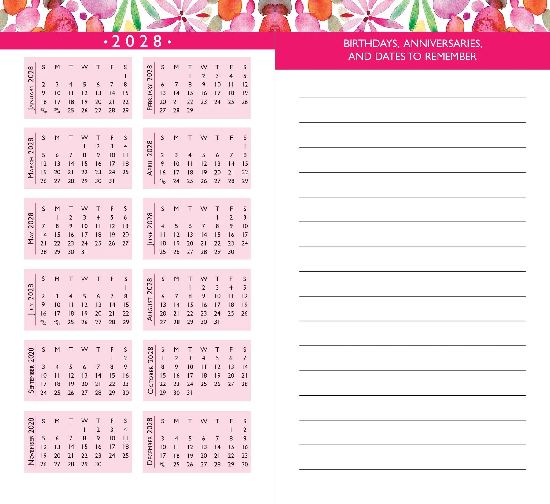 - Includes a page to note birthdays, anniversaries, and other dates to remember.