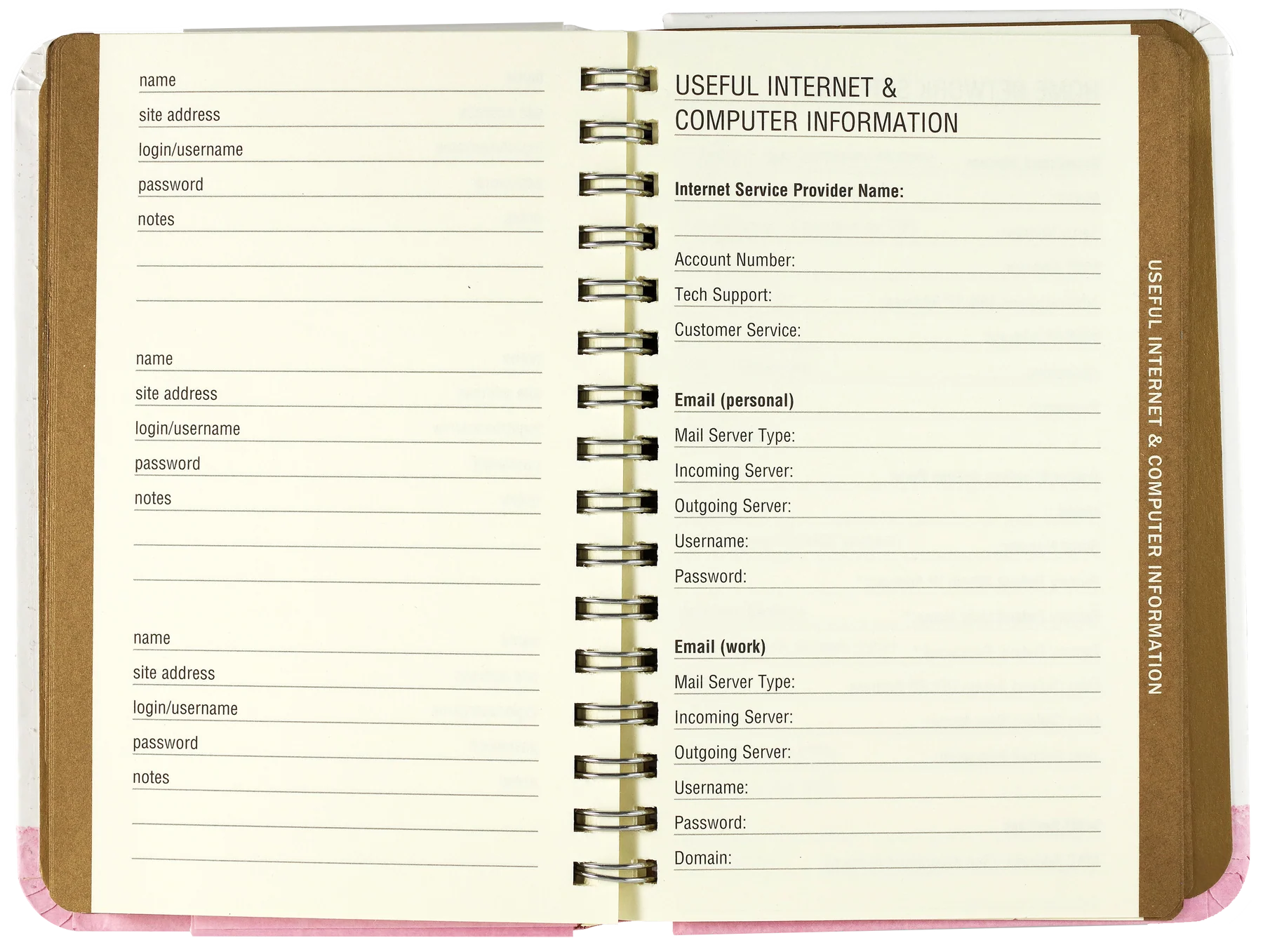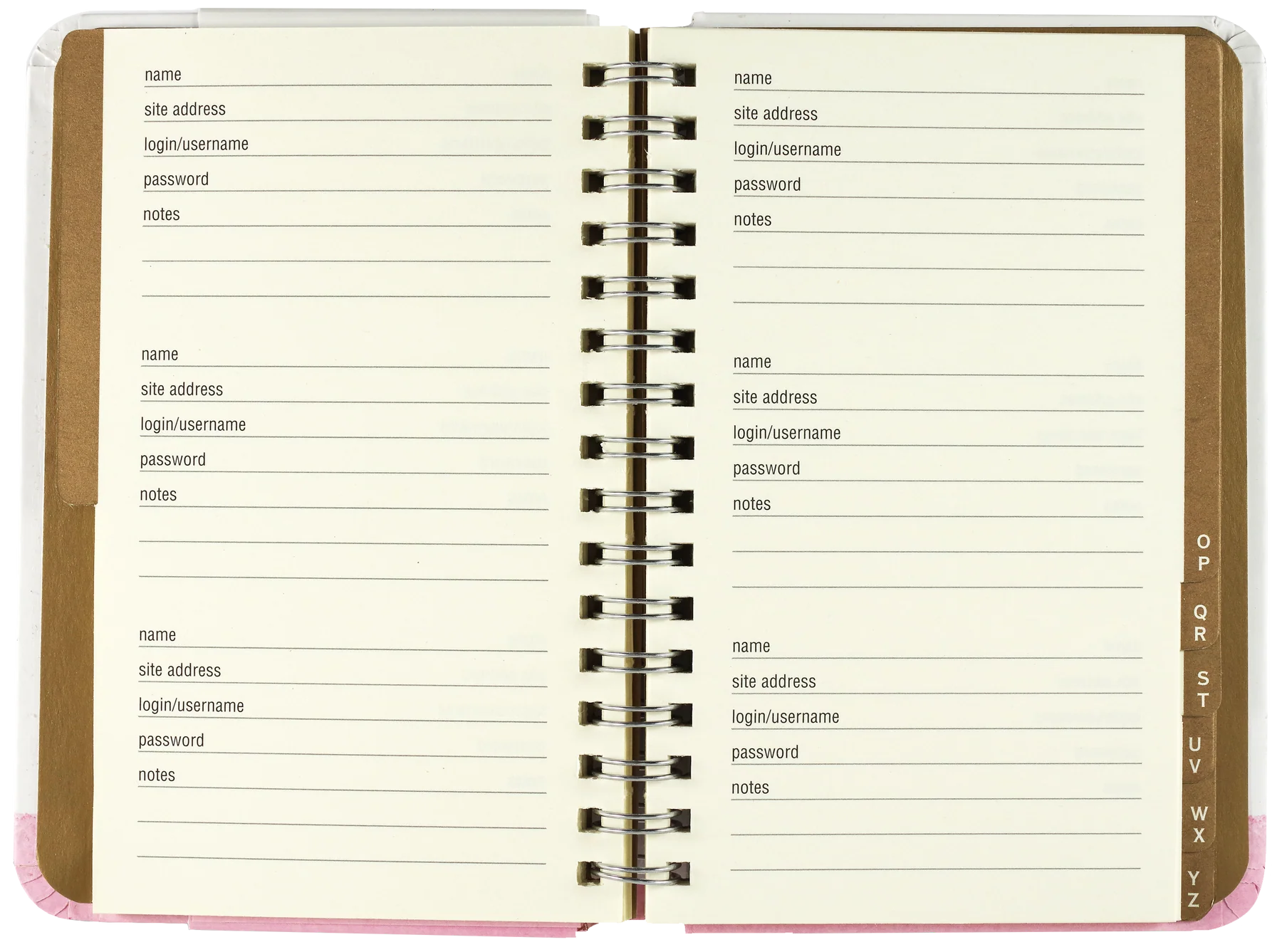 - This time- and headache-saving little volume is organized with tabbed A to Z pages, with space on each page to write down websites, usernames, passwords, and extra notes.