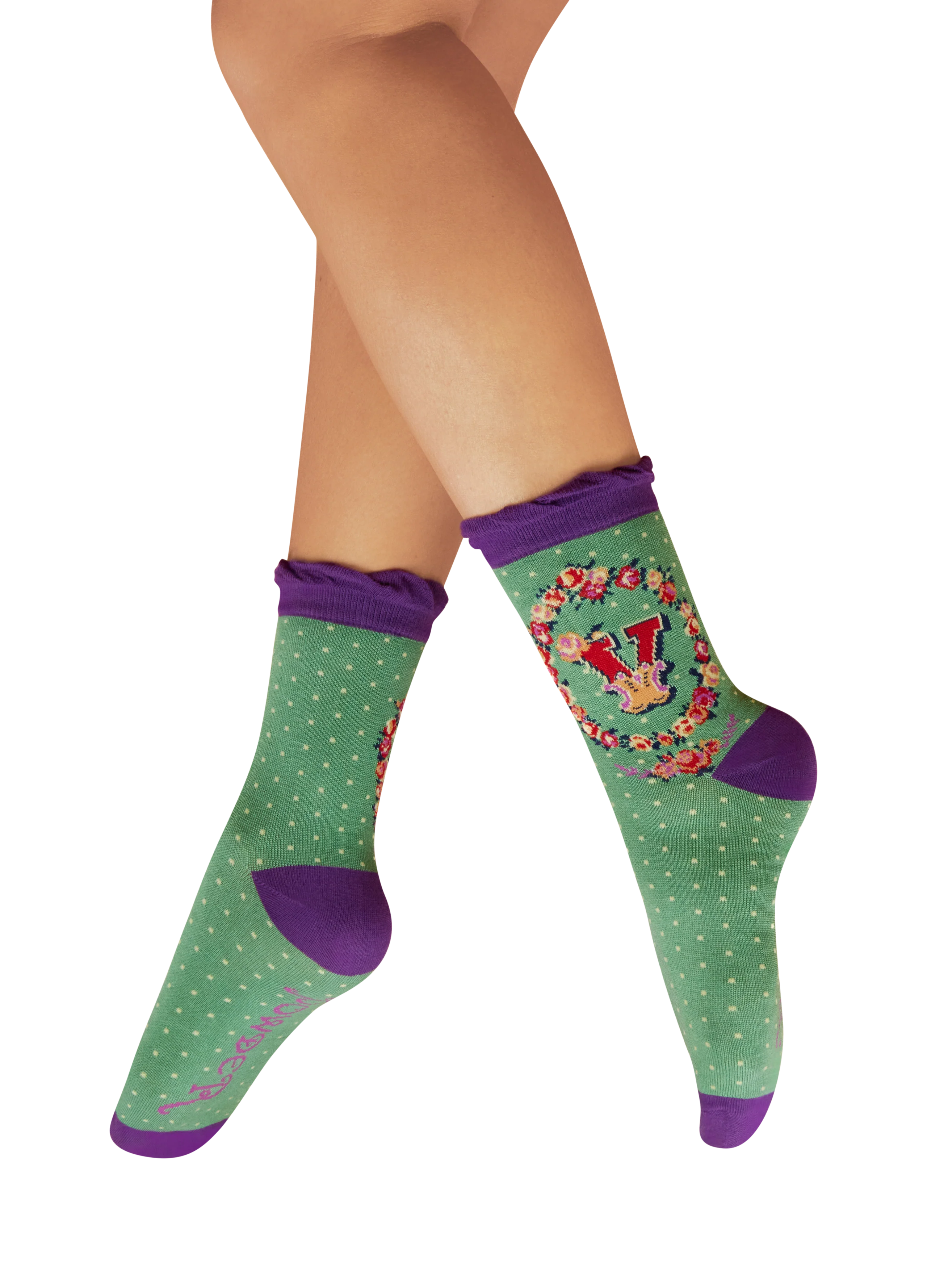 Letter Ankle Socks - V Sale! from 2495 /per Qty. Sold Out This item is currently on backorder but you can still purchase it now and we'll ship as soon as more become available. Made with bamboo, these best selling extra-soft women's monogrammed ankle socks will keep your feet stylish and warm. Measurement: Ladies Shoe Size 4-9 Fabric: 65% bamboo, 15% cotton, 10% nylon, 10% elastane SKU:5060548947316