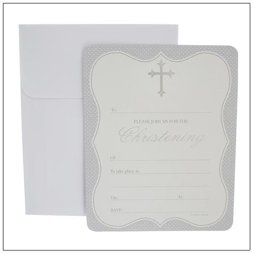 Christening Invitations (Pack of 20) Sale! from 1995 /per Qty. Add to Cart This item is currently on backorder but you can still purchase it now and we'll ship as soon as more become available. 20 invitations 20 envelopes 20 self adhesive magnetic strips Measure 125mm x 155mm