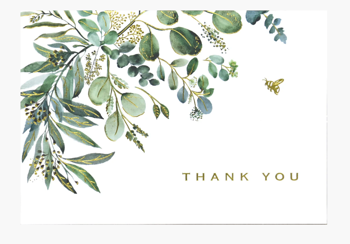 - Painterly botanical design combines watercolor greenery, a honeybee in flight, and the words ''Thank You,'' all embellished with jewel-like touches of gold foil.