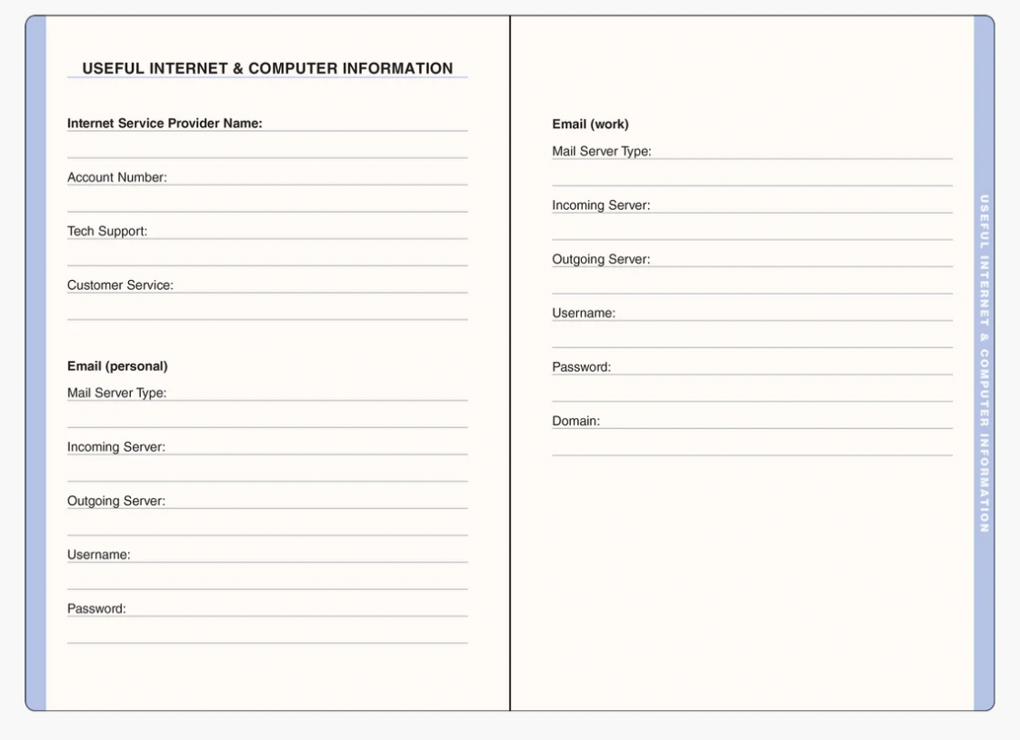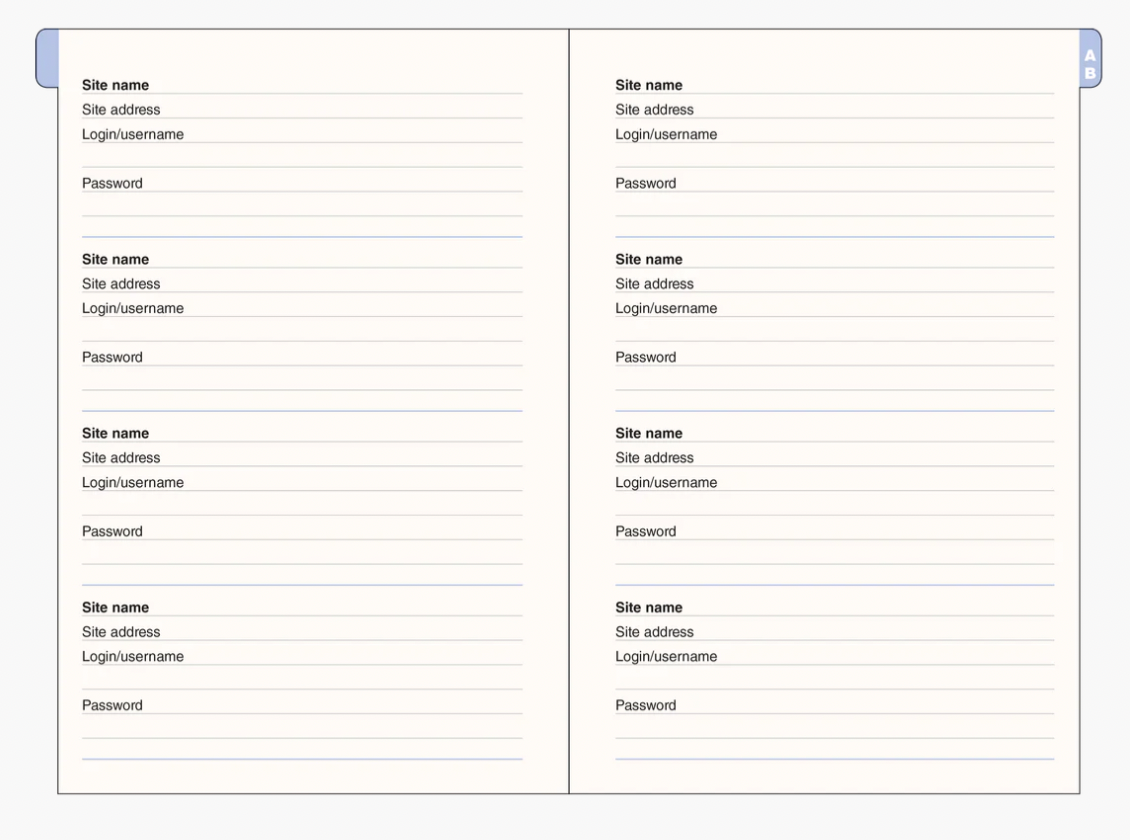- Space is provided on each page to write down website names, usernames, passwords, and extra notes.