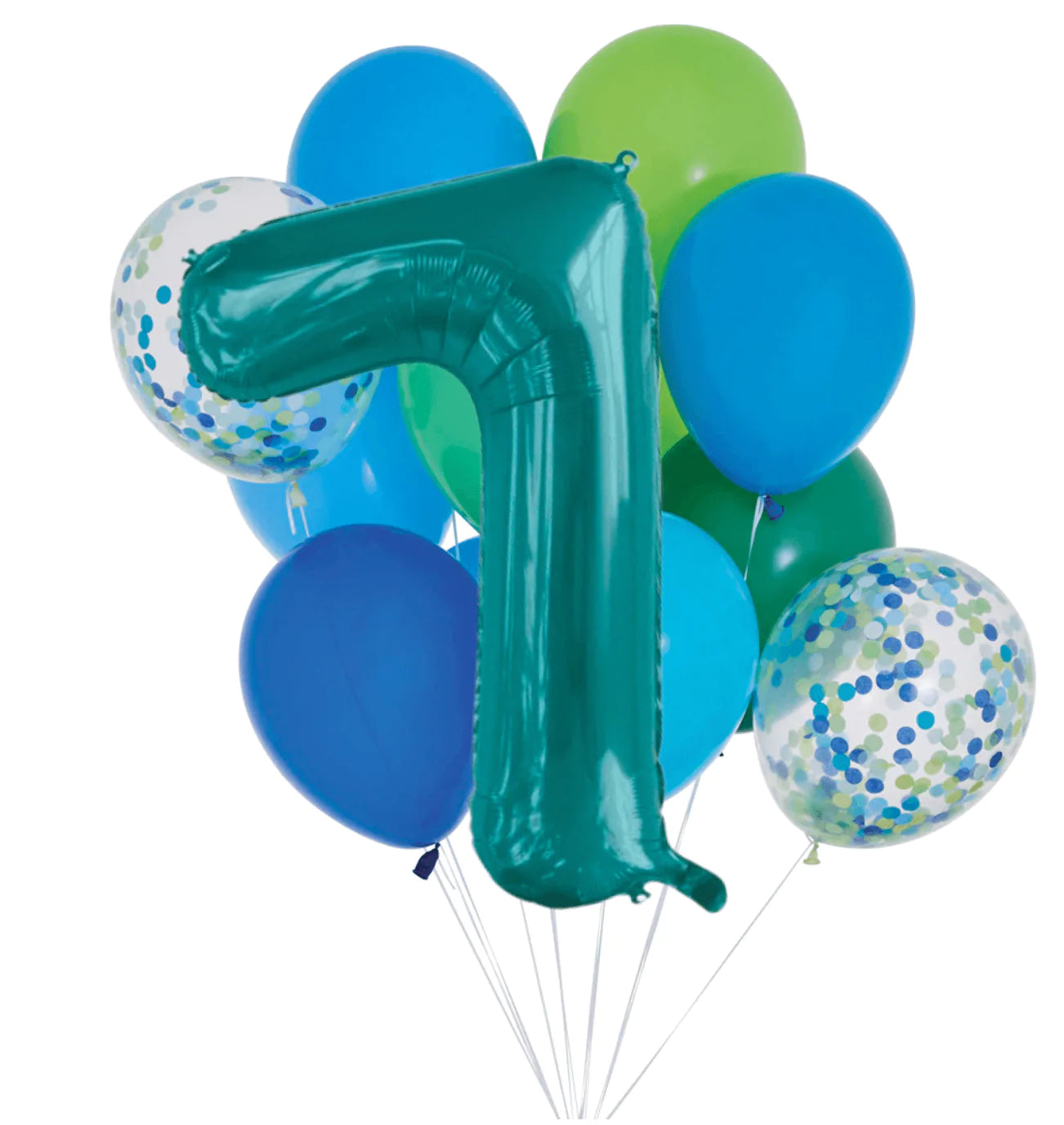 Balloon sets include 10 solid colour balloons of the highest quality latex in shades of blue and green, and 2 confetti-filled balloons with a teal 86cm foil number. Balloons are 30cm.