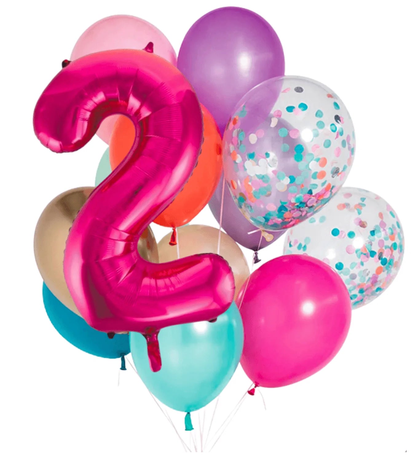 Balloon sets include 10 solid colour balloons of the highest quality latex in our Mermaid range of colours. Includes 2 confetti-filled balloons and an 86cm pink foil number. Balloons are 30cm.