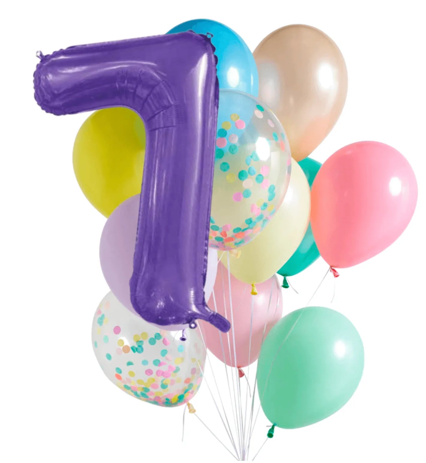 Balloon sets include 10 solid colour balloons of the highest quality latex in a pastel rainbow range of colours. Includes 2 confetti-filled balloons and an 86cm purple foil number. Balloons are 30cm.