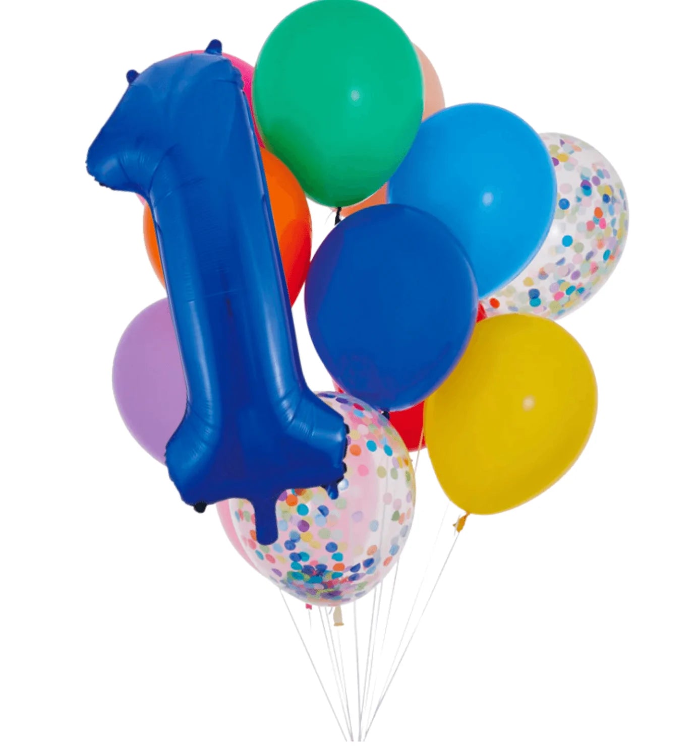 Balloon sets include 10 solid colour balloons of the highest quality latex in a rainbow range of colours. Includes 2 confetti-filled balloons and an 86cm blue foil number. Balloons are 30cm.
