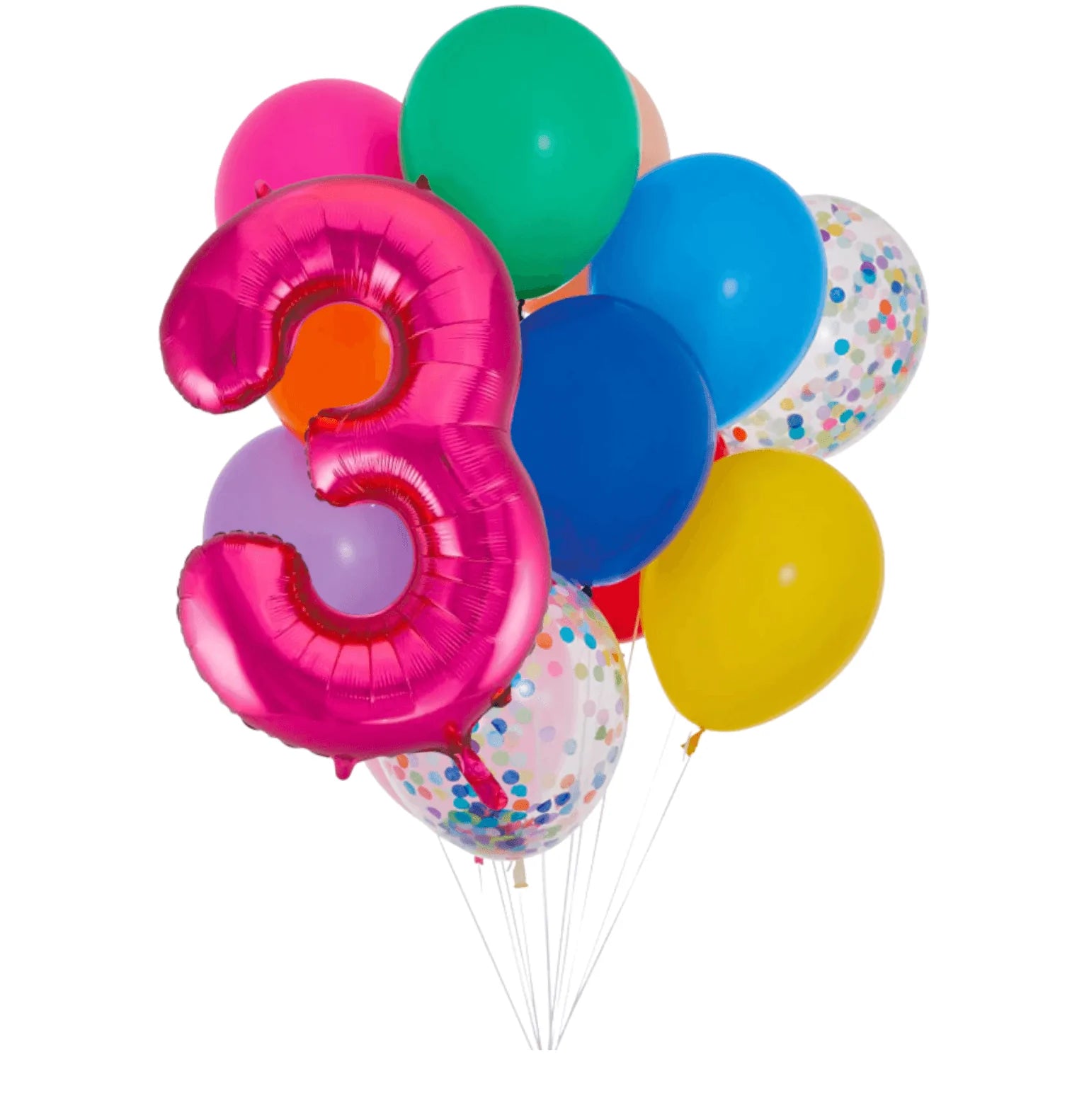 Balloon sets include 10 solid colour balloons of the highest quality latex in a rainbow range of colours. Includes 2 confetti-filled balloons and an 86cm pink foil number. Balloons are 30cm.