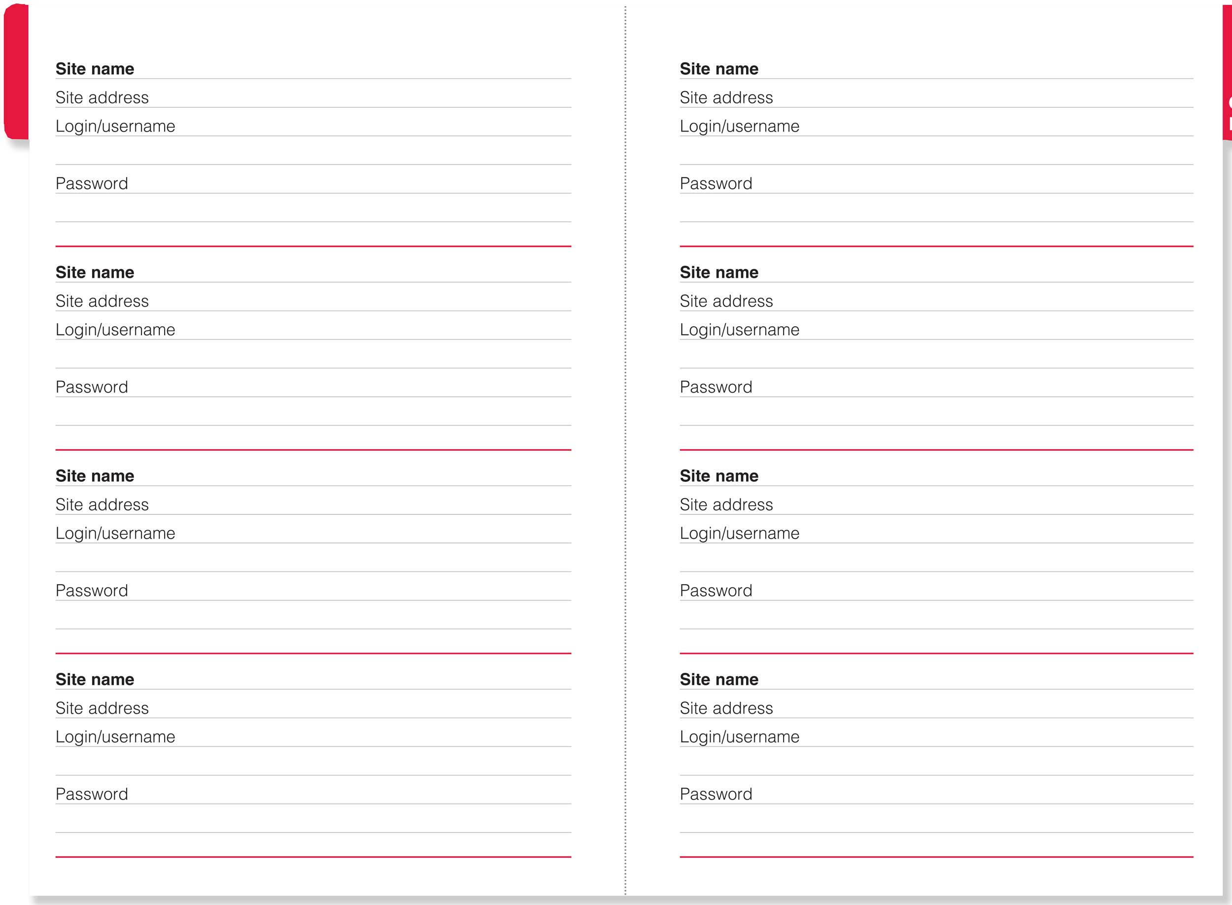 - Plenty of room for website addresses, usernames, passwords, and additional notes
