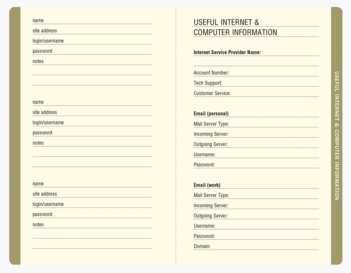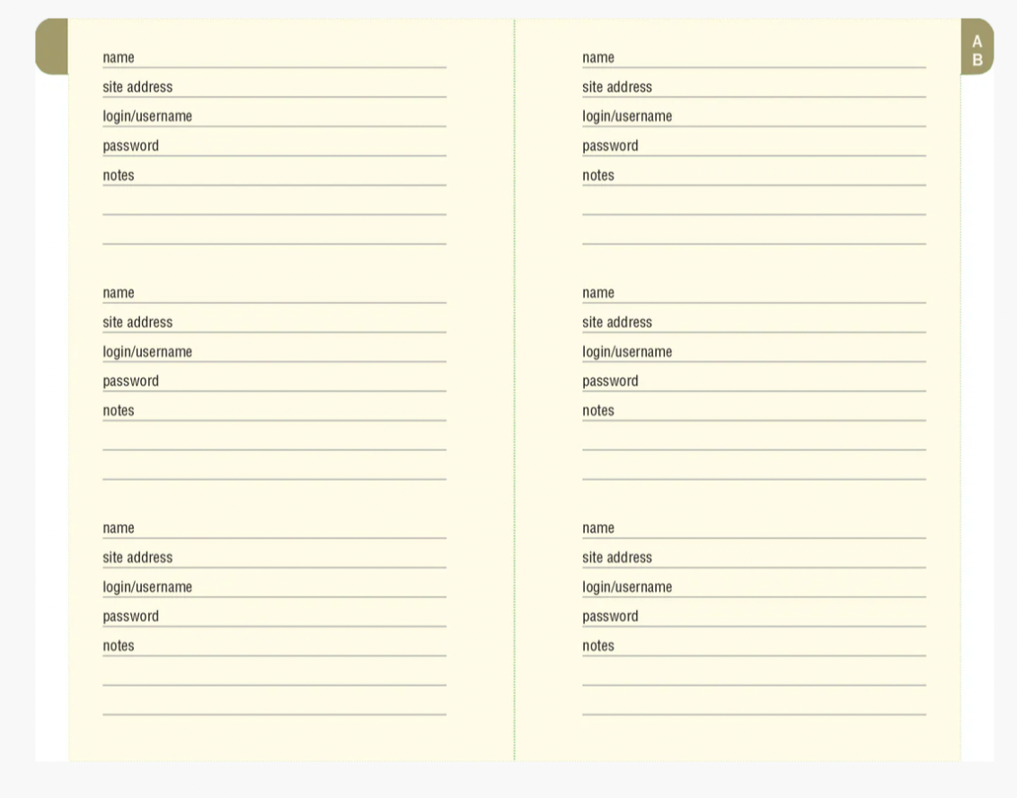 - This time- and headache-saving little volume is organized with tabbed A to Z pages, with space to list websites, usernames, passwords, and extra notes.