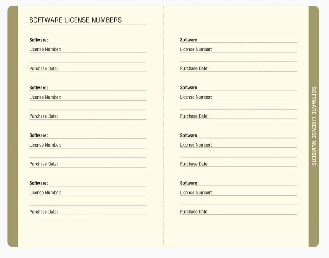 - Record notes on home network configurations, software license numbers, etc., too, in pages in the back of the book.