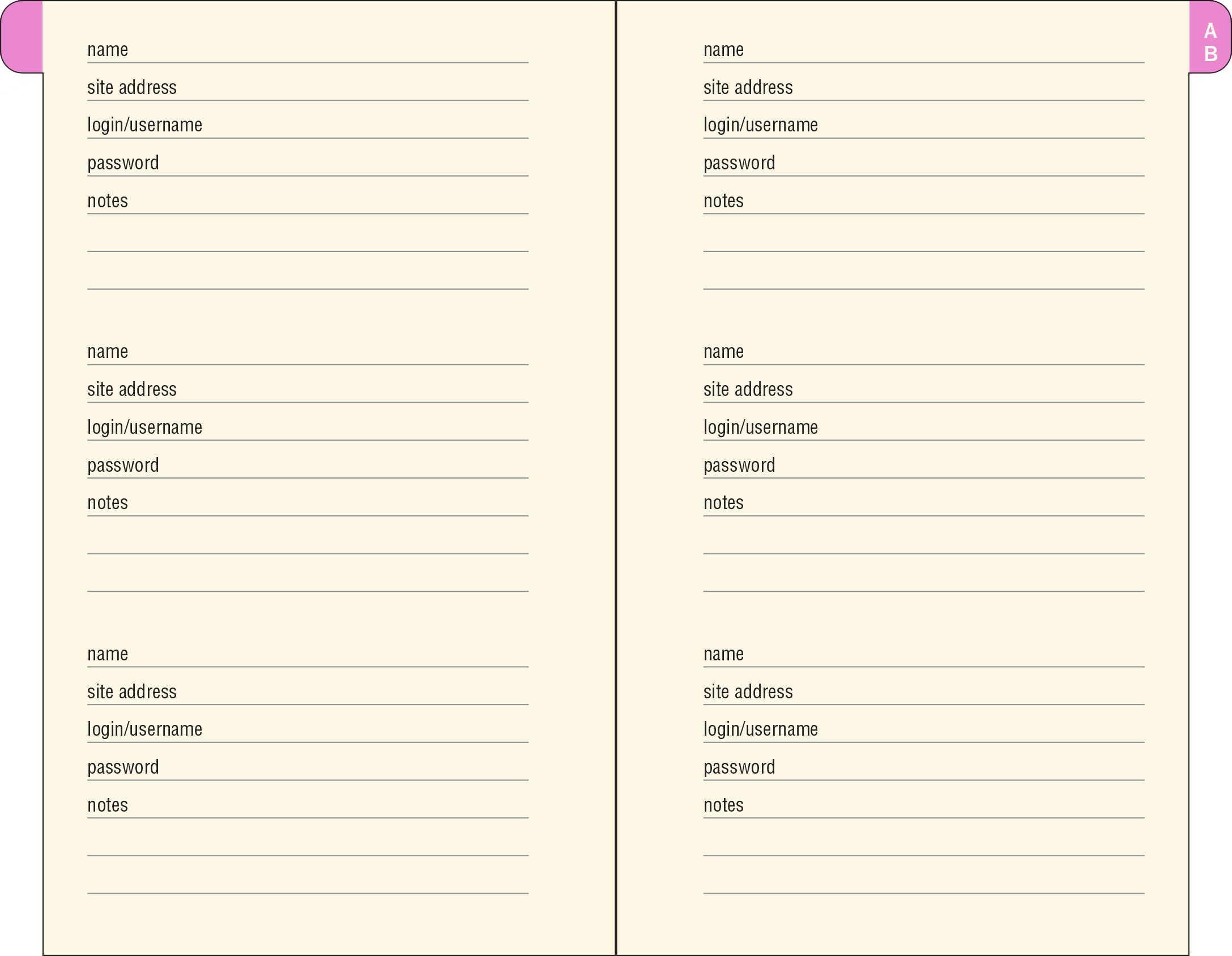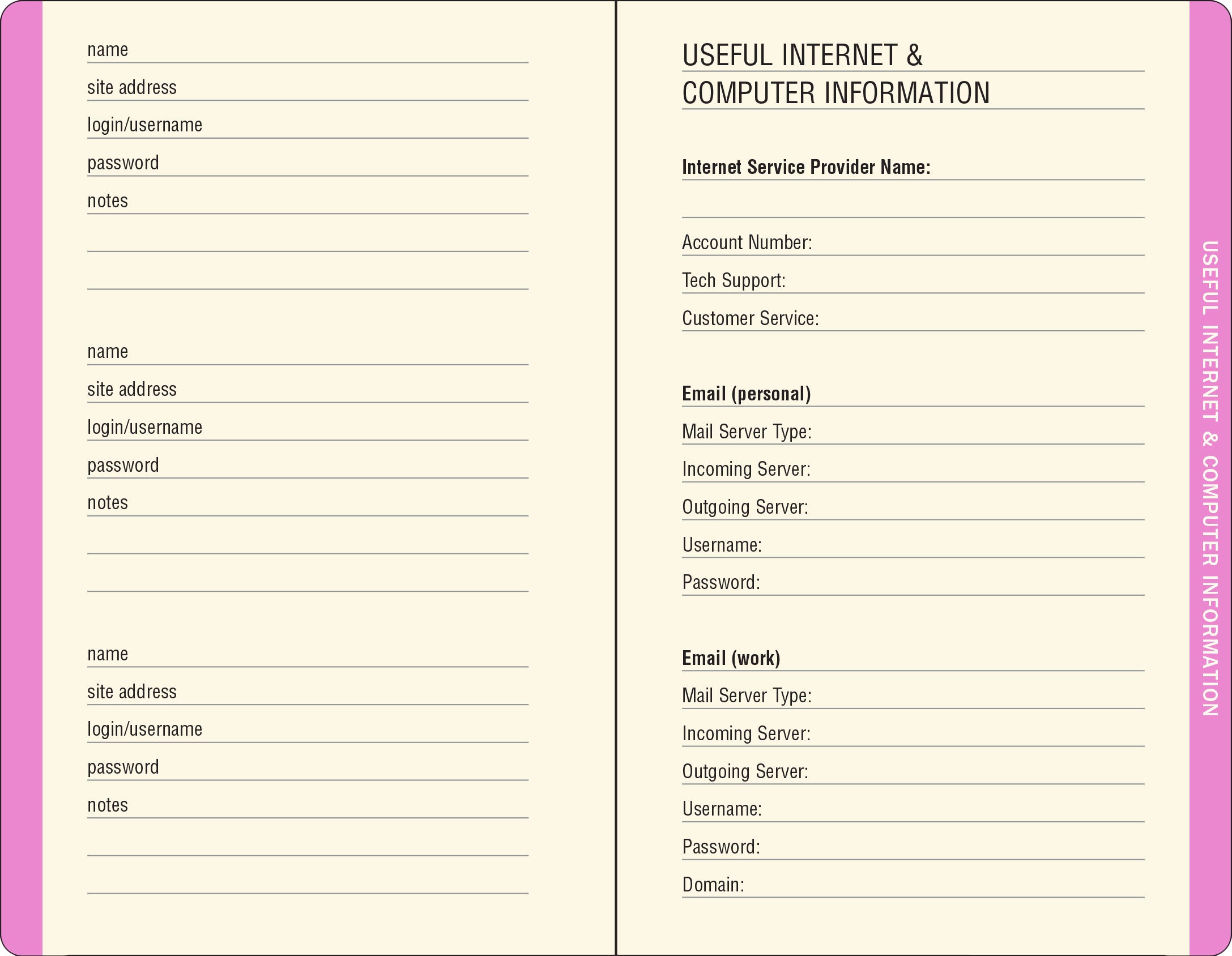 - This time- and headache-saving little volume is organised with tabbed A to Z pages, with space to list websites, usernames, passwords, and extra notes.