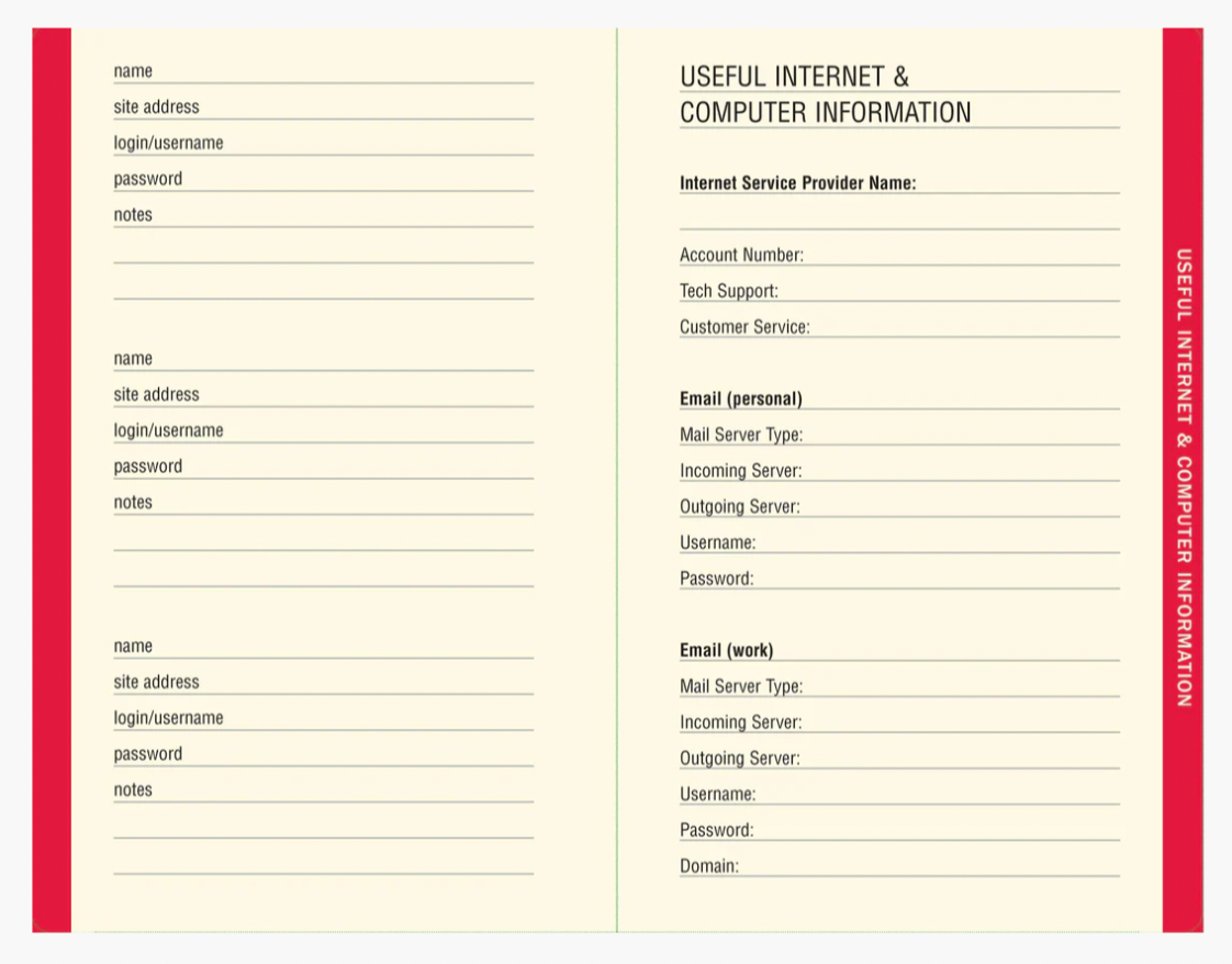 - This time- and headache-saving little volume is organized with tabbed A to Z pages, with space on each page to write down websites, usernames, passwords, and extra notes.