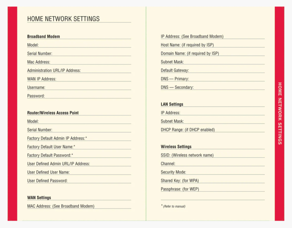 - You can also make notes about home network configurations, software license numbers, etc., in pages in the back of the book.