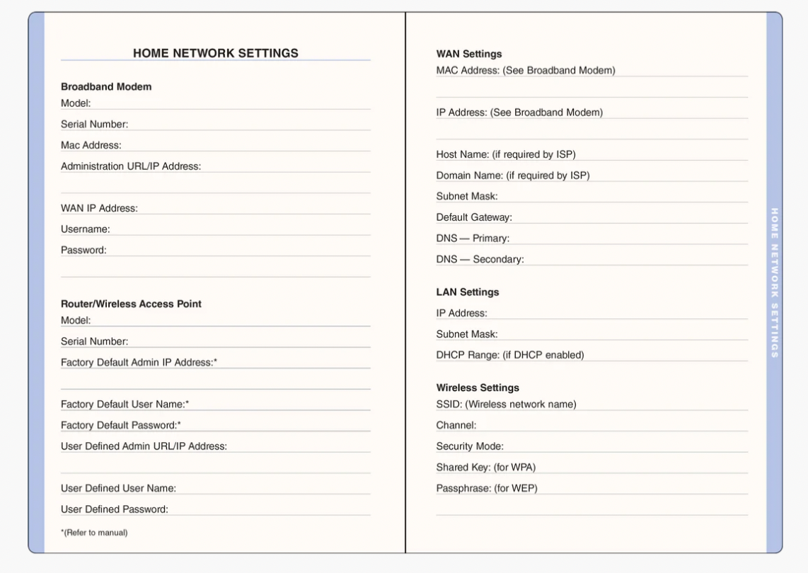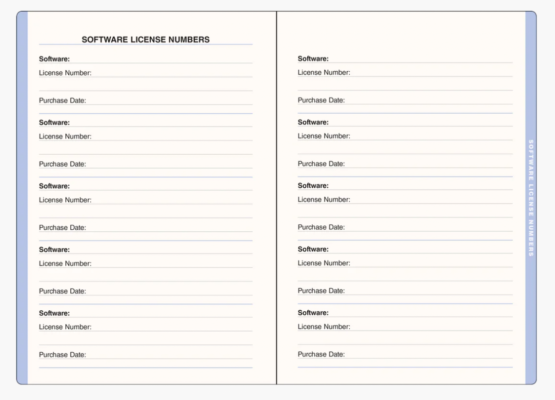 - Pages in the back of the book provide space to record notes about network configurations, software license numbers, etc.