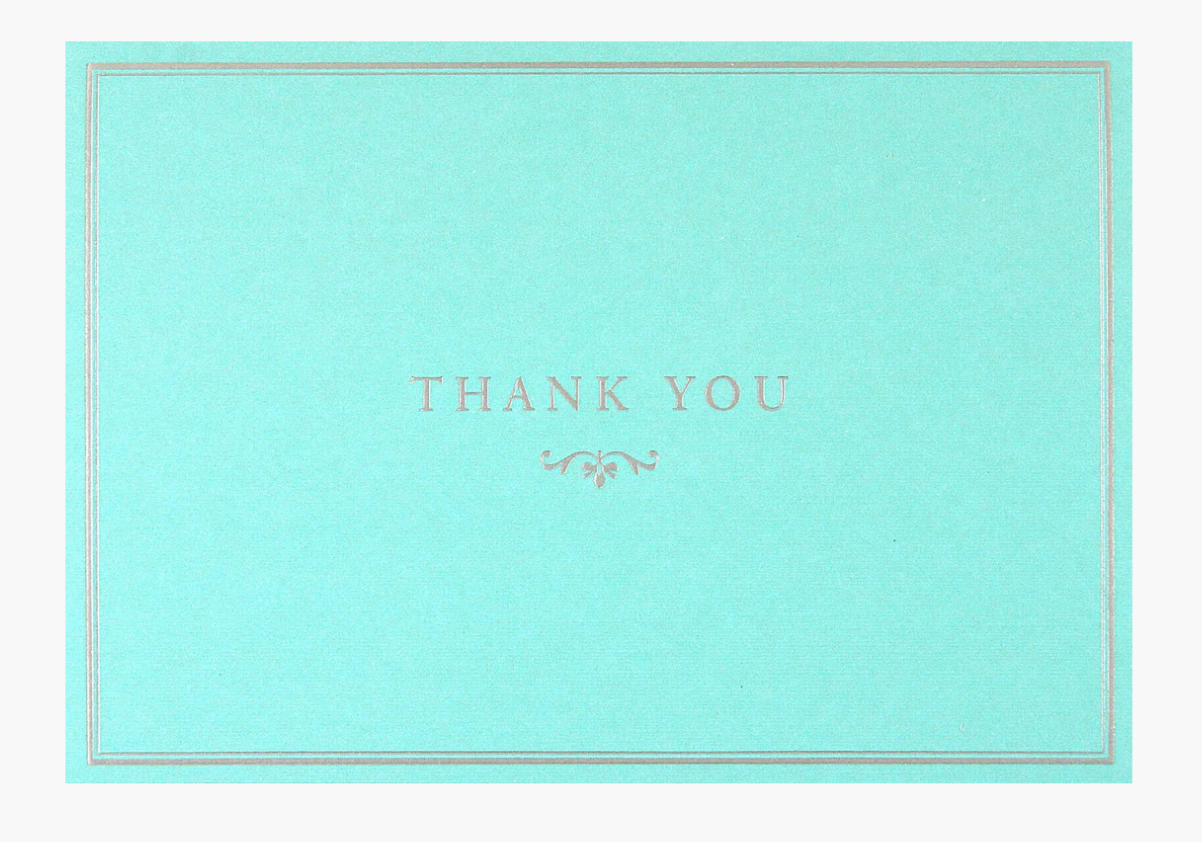 - The words "Thank You" and the decorative flourish below are embossed in silver foil.