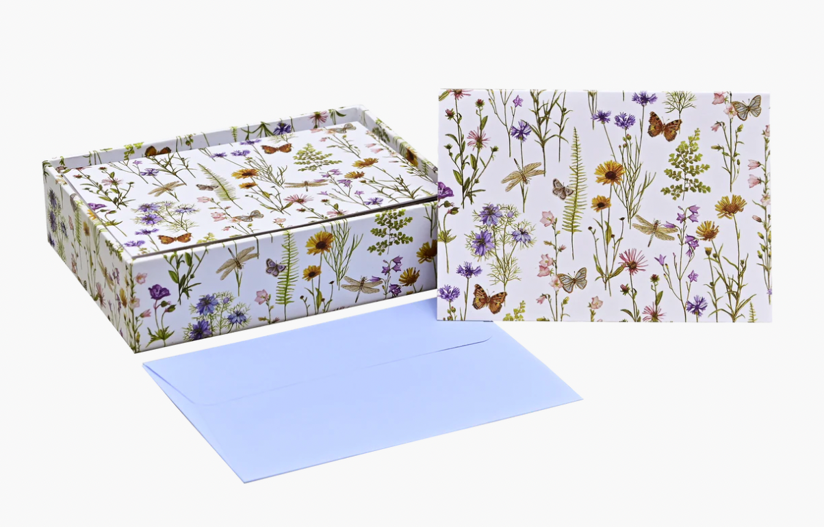 Softly hued butterflies, dragonflies, ferns, and flowers are combined with shimmering gold foil embellishments and a fresh, matte-white background on these elegant note cards.