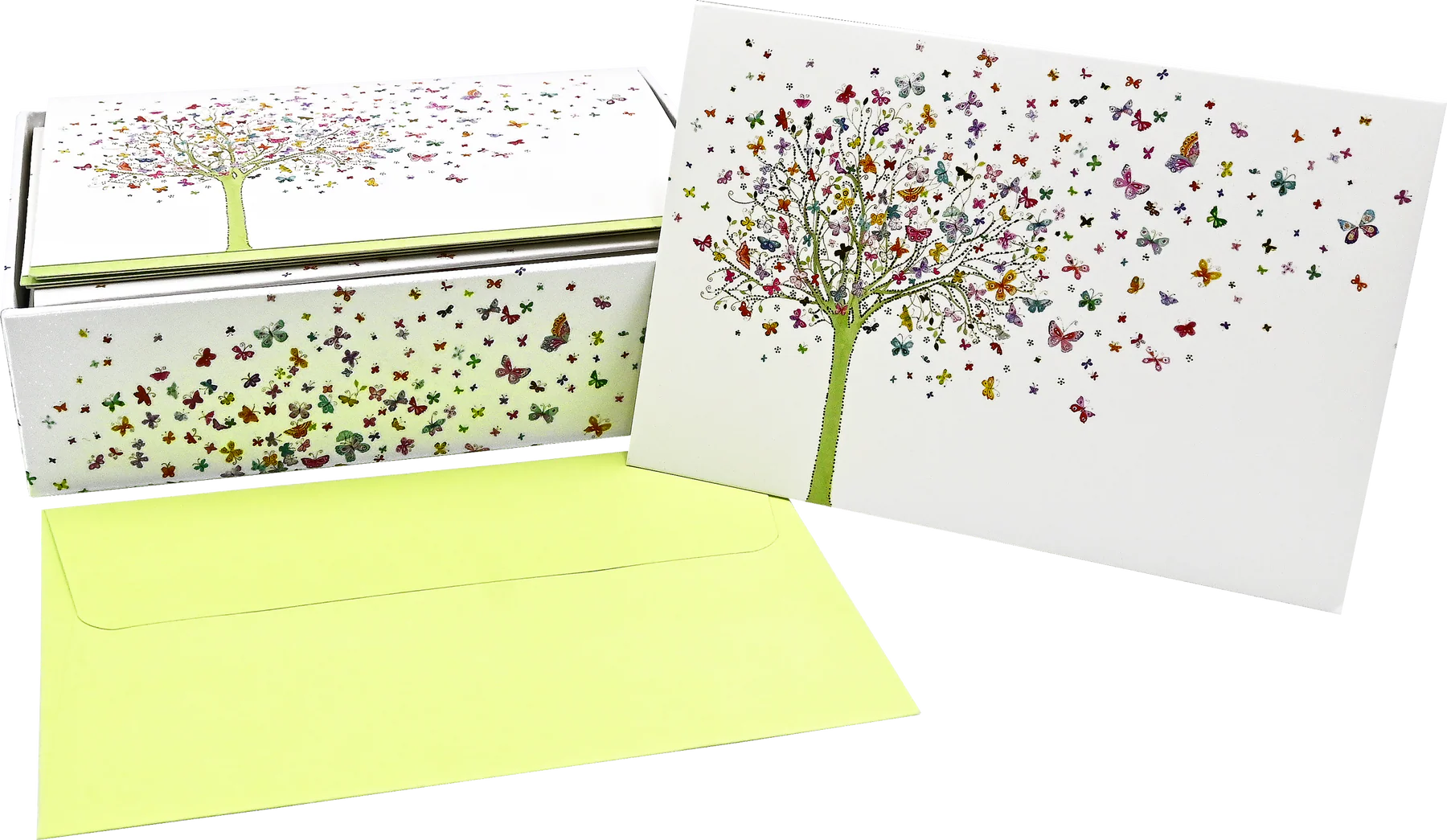 - Card design depicts a fanciful pastel tree enveloped in butterflies!