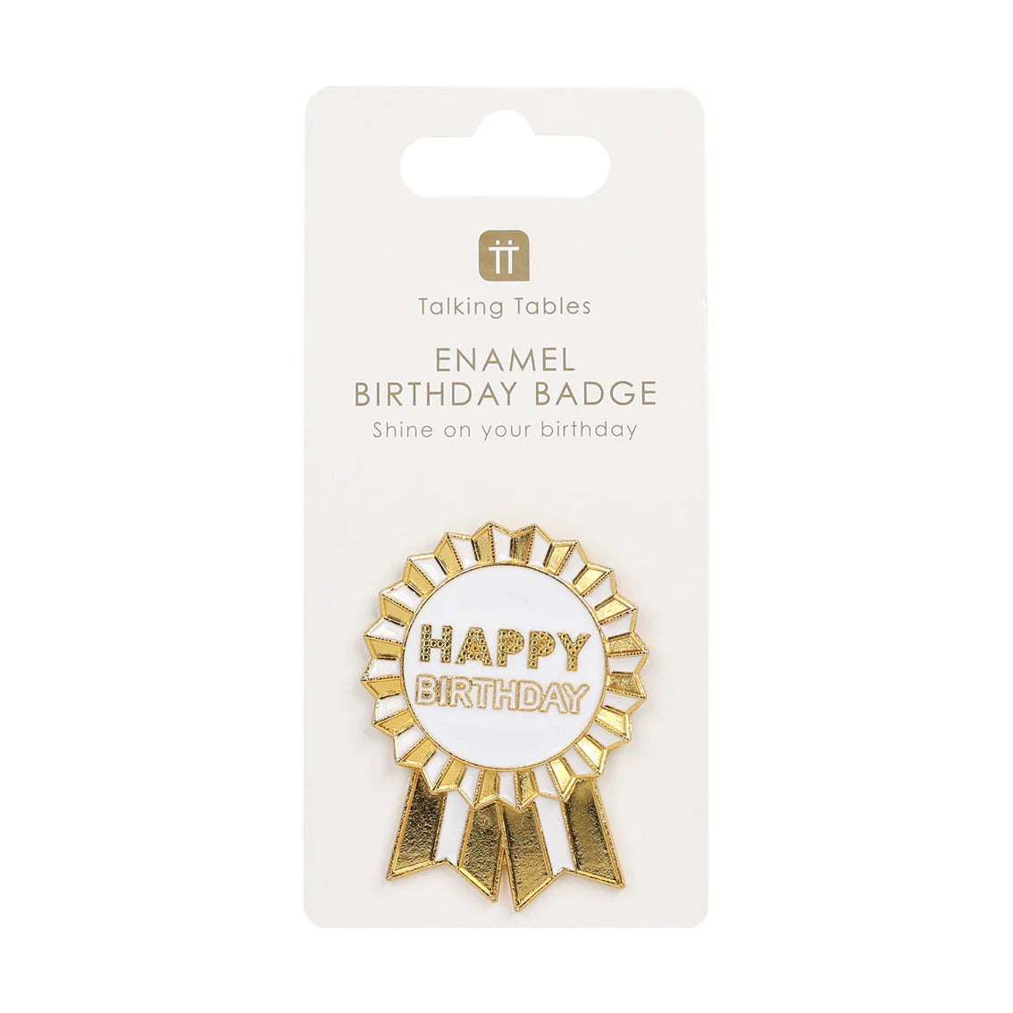 Add to the excitement of a loved one’s birthday with this gorgeous, glossy birthday badge. Crafted from gold and white enamel, the badge is shaped like a classic rosette with ‘Happy Birthday’, adorned in the middle. Measuring at 6cm, it comes in both this lustrous colourway and a brightly coloured version.
