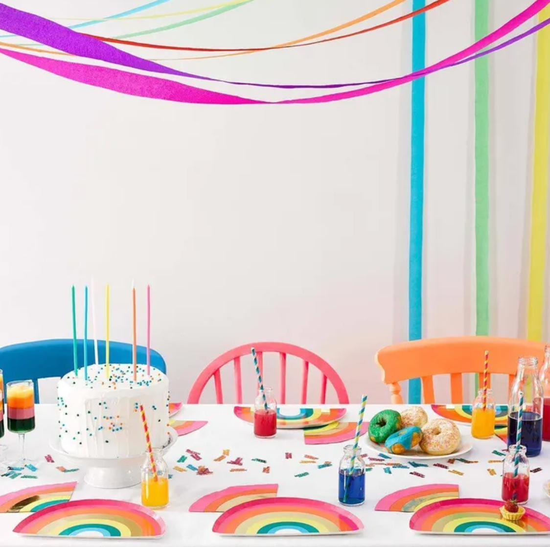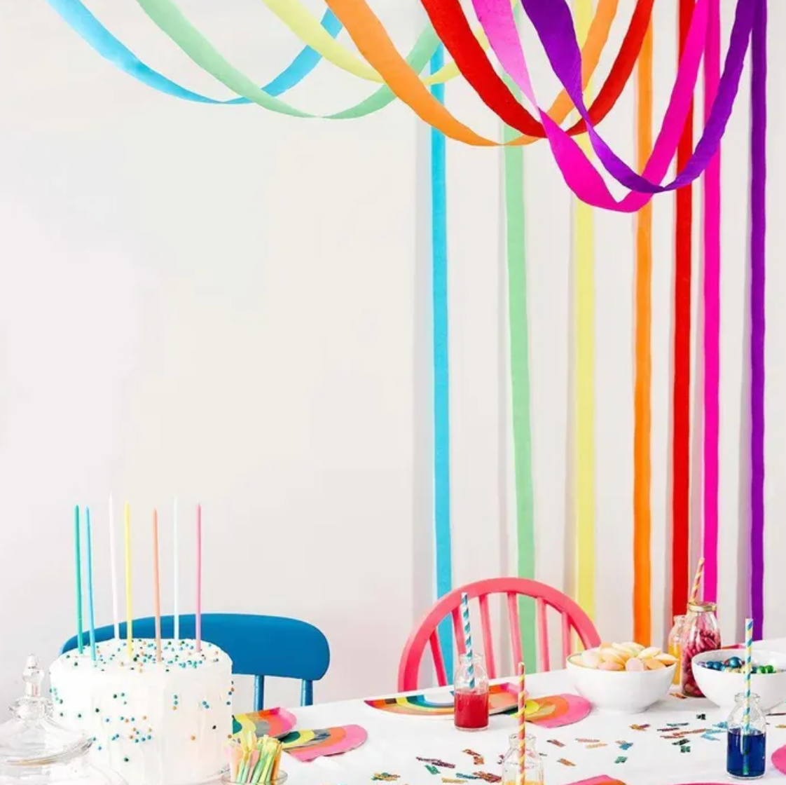Bring instant joy to your party with these bold rainbow streamers. Featuring vivid shades of pink, orange, yellow, green, blue and purple, they create a striking backdrop that transforms any space into a colourful celebration. Perfect for hanging from ceilings, walls or tables, their cascading ribbons add movement and energy to your party décor.