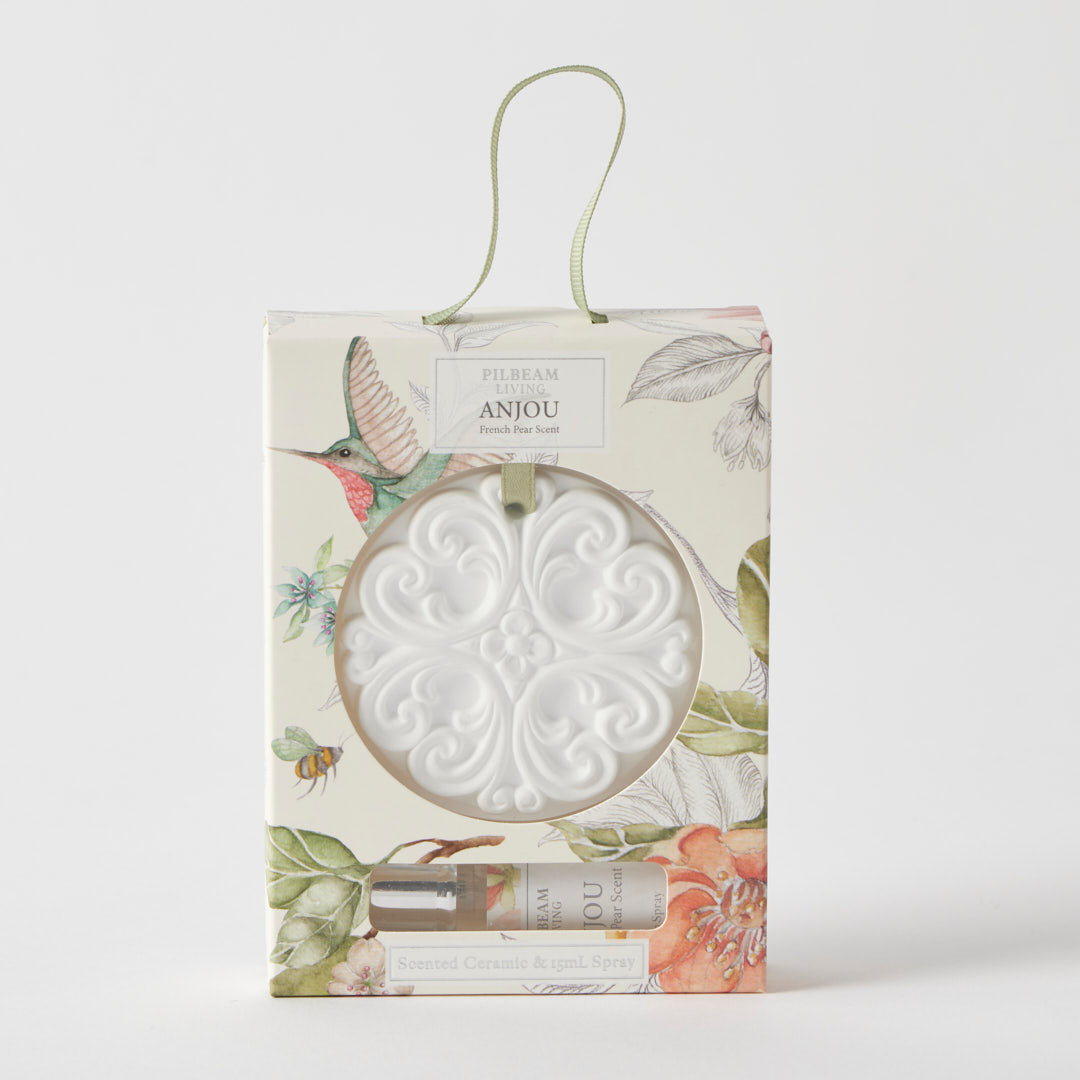 This intricately designed ceramic disc offers a subtle way to fragrance wardrobes, drawers, bathrooms, or other small spaces. Simply spritz with the included 15ml fragrance spray to enjoy a warm scent of Pear with a touch of Floral. Finished with a ribbon for easy hanging, it’s a thoughtful gift or a charming addition to any home fragrance range.