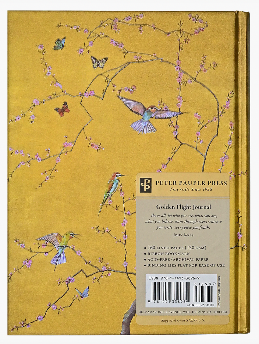 Radiant journal depicts jewel-like birds, butterflies, and a cherry tree, against a golden background.