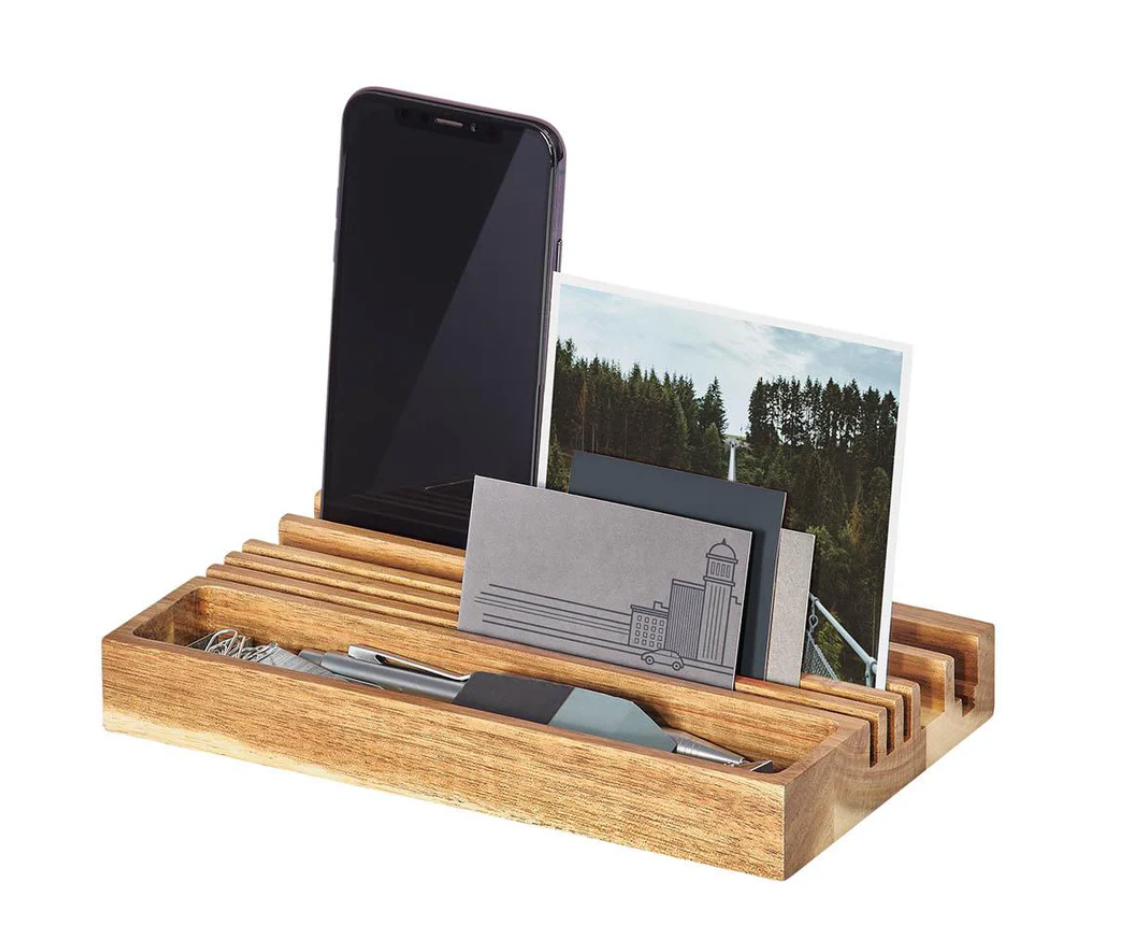 - Features a phone stand, pen/stylus tray, storage for paper documents and business cards and a pocket for small stationery items