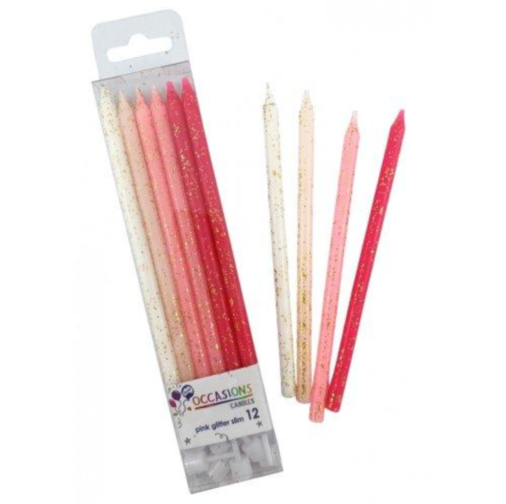 Pink Glitter Slim Candles 120mm Sale! from 695 /per Qty. Add to Cart This item is currently on backorder but you can still purchase it now and we'll ship as soon as more become available. Box of 12 Contains holders