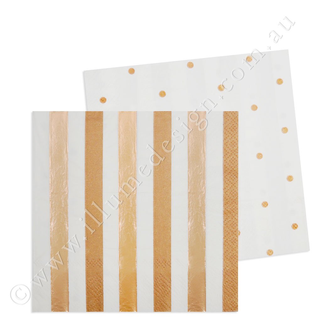 Rose Gold Stripes & Dots Cocktail Napkin Sale! from 795 /per Qty. Add to Cart This item is currently on backorder but you can still purchase it now and we'll ship as soon as more become available. Each pack contains 20 paper napkins made of high-quality thick paper Colour: Rose gold print with rose gold foiling Size: 12.5cm when folded Material: Thick 3ply paper